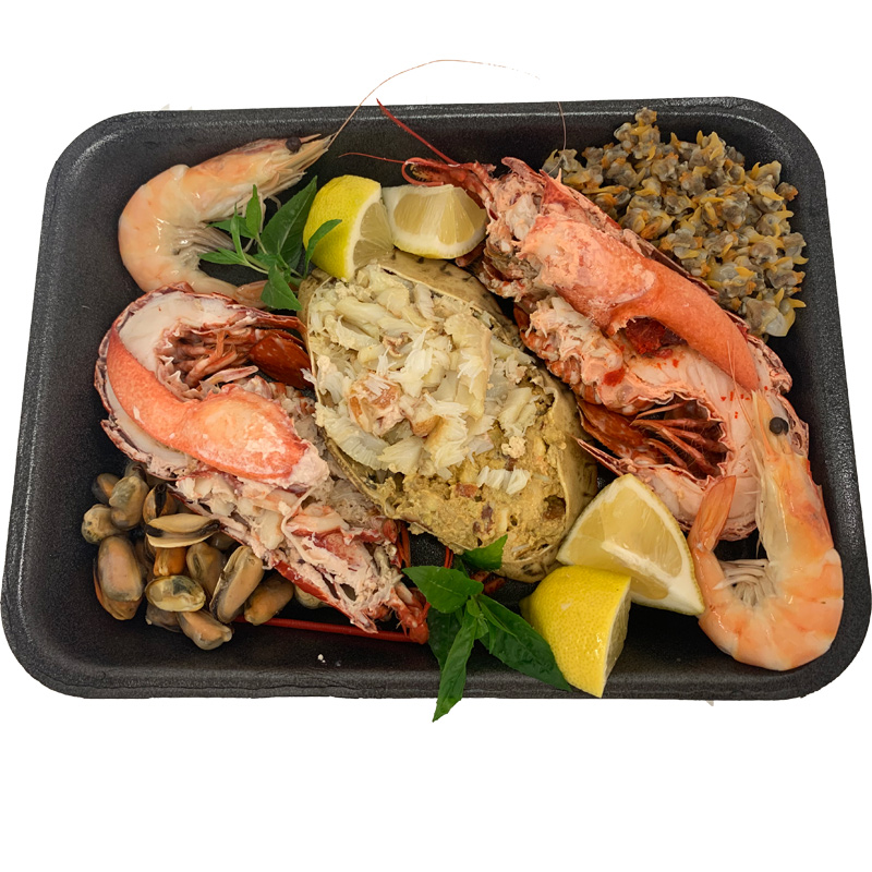 Dressed Welsh Crab, Two halves of a dressed Welsh lobster, two crevettes and 75g each of cooked cockles and mussel meat, garnished with lemon wedges.